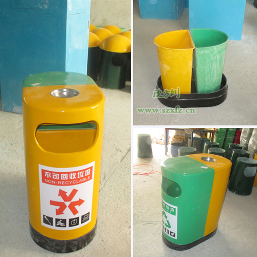 環(huán)保分類玻璃鋼垃圾桶 學(xué)校的首選深圳寶安沙井實驗學(xué)校,是欣方圳老顧客了。按照之前訂購的玻璃鋼垃圾桶樣板生產(chǎn),發(fā)實物照給工廠的廠長確認。A21玻璃鋼環(huán)保分類垃圾桶的規(guī)格為:680*400*850mm.這款垃圾桶來頭可不小哦,它是獲得了專利外觀設(shè)計的玻璃鋼垃圾桶。每個產(chǎn)品是經(jīng)過的嚴格生產(chǎn)程序制造出來,貼上產(chǎn)品合格證,符合企業(yè)高品質(zhì)標(biāo)準。玻璃鋼垃圾桶一邊嫩綠,一邊中絡(luò)黃,底座黑色,外加一個煙灰缸巧妙的搭配,簡潔、美觀。桶蓋/桶身采用FRP玻璃鋼復(fù)合材料制造,具有防腐、防盜、防生銹、易清潔等特點,表面涂層采用高分子耐老化膠衣涂層,色澤明快、持久。