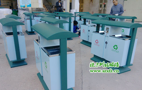 深圳龍崗區(qū)街道辦采購(gòu)F95戶外鋼板分類垃圾桶,按照15天交貨日期,如期完工,送貨上門(mén)。此款F95戶外鋼板分類垃圾桶規(guī)格為:1000*400*1000.鋼制垃圾桶屋檐桶頭設(shè)計(jì),防止雨水傾入內(nèi)桶。煙頭投口,分類垃圾,隔絕火患。有害投口,充分利用空間。桶兩邊都絲印有,標(biāo)志,字體,不可回收字樣,采用紅顏色。 標(biāo)志,字體,可回收字樣,采用綠顏色。巧妙的設(shè)計(jì),結(jié)合城市人性化,更好服務(wù)城市居民。