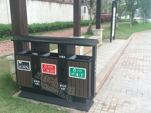 訂購此款G77鋼木垃圾桶是清遠的一家房地產企業,用來改造環境,綠化家園。G77-2三分類塑木垃圾桶的規格為:134*360*1000.所有的五金 部分為黑色啞光,裝門的軸采用不銹鋼,不能生銹。內桶為鍍鋅板厚度為0.4mm,塑木按照之前寄給客戶確認過的樣品來制作。經過201#不銹鋼表面烤漆啞 光,鋼木防腐,堅固耐用,具有色澤、紋理逼真等特點,與花草樹木搭配成一條自然的風景線。讓人們隨時隨地置身于悠閑環境,感受自然懷抱,呼吸空氣、享受自 然生活。
