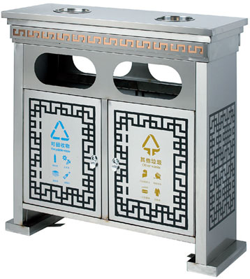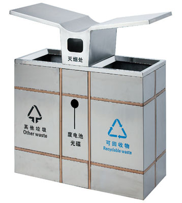 深圳新標準城中村街道社區不銹鋼五分類垃圾桶由有害垃圾、玻璃、金塑紙(為金屬、塑料、紙張的簡稱)、廚余垃圾、其他垃圾這5分類不銹鋼垃圾桶組合而成。其中金塑紙、其他垃圾日常產生量較大,所以分類收集容器也