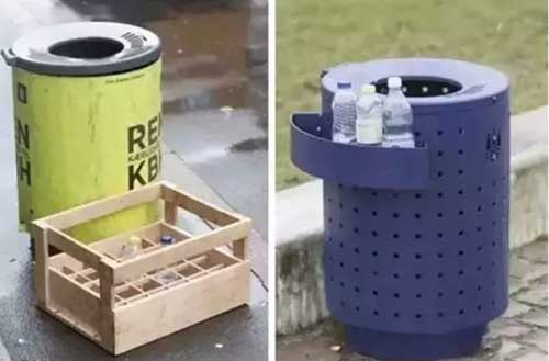 丹麥政府為此推出了一款新的垃圾桶放在街頭,這些新的垃圾桶非常人性化,考慮到拾荒者身材都不會太高,將垃圾桶高度降低30厘米,而且還經過特別設計,讓他們方便翻找,從此不用再卷起衣袖伸手入骯臟的垃圾箱找水瓶了。