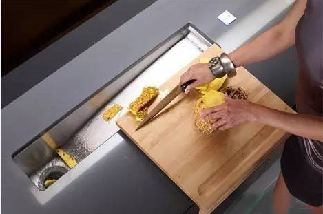 水槽是個(gè)整合的垃圾處理裝置,水槽采用了傾斜設(shè)計(jì),垃圾會(huì)沿著斜坡下沉。另外,這個(gè)水槽還采用了靈活的觸摸技術(shù),清洗周期由固定不變的藍(lán)光顯示,垃圾處理周期由閃爍的藍(lán)光顯示。
