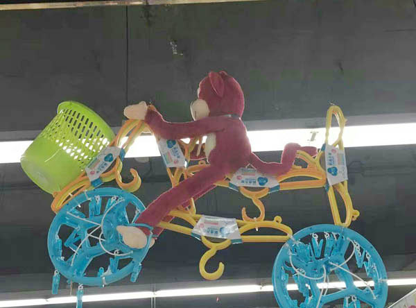 在這家超市的日用品售賣區(qū),“猴兒騎自行車”掛在頂棚處,兩個衣架為車輪,若干個衣掛組成扶手、橫梁、車座,垃圾桶則恰到好處地在車前成為車筐。整個造型創(chuàng)意十足、形象逼真、顏色鮮艷、熱鬧有趣,很多逛超市的市民看到了都感嘆“太有才啦!”。