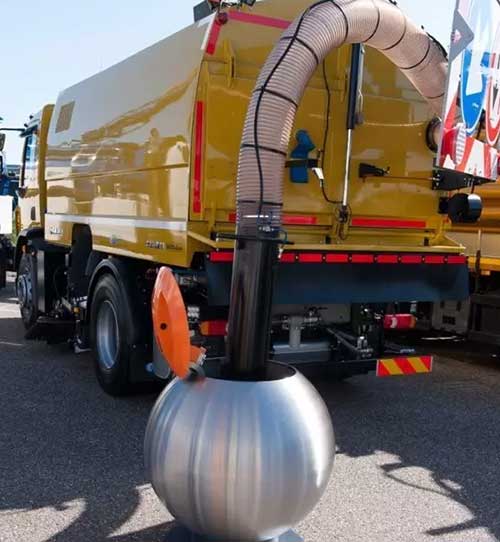 該系統(tǒng)配有專用工作車輛,在車身背后配掛一根超長的管子,掀開泡泡垃圾桶的蓋子,司機(jī)取下管子,把管子從上方放入圓球,利用產(chǎn)生高效的空氣旋渦,就像一臺強(qiáng)勁的吸塵器快速把垃圾集速吸走。這樣一來,既減少了管理上的人工、物耗,又不會造成路面多余的污漬痕跡。