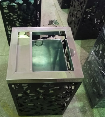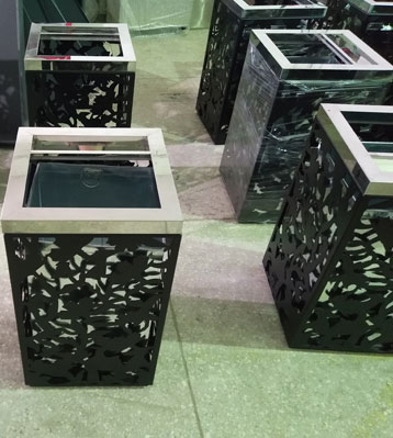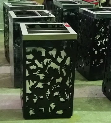 鋼制環衛垃圾桶外筒采用優質冷軋鋼激光切割圖案,四面花紋圖案一樣,酸洗磷化表面噴塑黑色啞光。內膽采用加厚鍍鋅板制作,整體美觀防銹耐用。