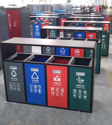 戶外金屬烤漆四分類果皮箱采用足厚優質冷板材質制作,做工扎實精良,表面打磨拋光無利口不傷手,產品符合生活垃圾分類要求。