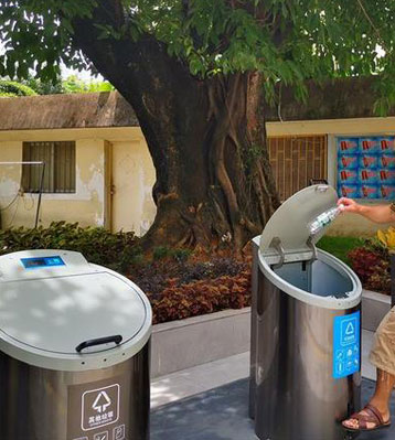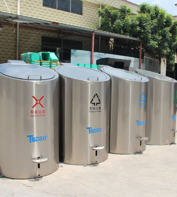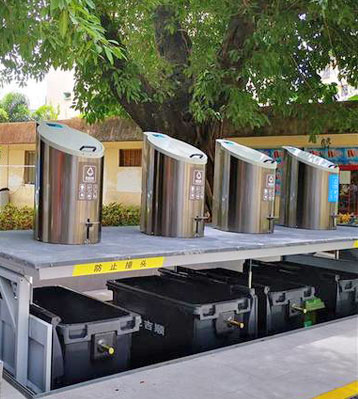 由地面小區標準4分類不銹鋼果皮箱和地埋隱藏的660L大垃圾桶組合而成,垃圾由不銹鋼桶身投放后掉到地下大垃圾桶中密閉存儲,防異味蚊蟲清潔環保。